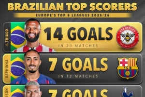本赛季五大联赛巴西球员射手榜(仅统计联赛)