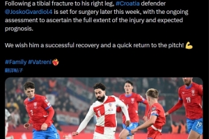 克罗地亚足协写道:“由于右腿胫骨骨折,克罗地亚后卫格瓦迪奥尔定于本周晚些时候接受手术。目前的评估工作仍在进行中,以确定伤情的严重程度以及预后。”