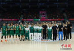11月5日,在东莞篮球中心举行的第十五届全国运动会篮球项目男子成年组小组赛中,澳门队60:124负于辽宁队。图为赛后两队合影。 中新社记者 韩海丹 摄