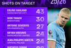 英超前21轮比赛结束,数据网站squawka统计了英超本赛季截止目前的射正榜。