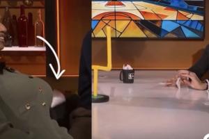 纳什表演纸张橄榄球,纸三角不慎弹出击打到了美女主持Taylor Rooks的胸部,其他三人笑死了,纳什本人尴尬地钻下桌子,捡起掉落的纸三角。