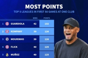 体育资讯1月12日讯 德国转会市场统计了五大联赛单一俱乐部主帅前50场联赛的积分,并列出前50场联赛拿分最多榜单,孔帕尼执教拜仁前50场联赛拿到126分,仅少于瓜迪奥拉。