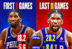 刚复出那几场,恩比德状态也比较一般。他出场的前9场比赛,场均只有18.2分5.6篮板3助攻,投篮命中率40.7%,真实命中率51.8%。